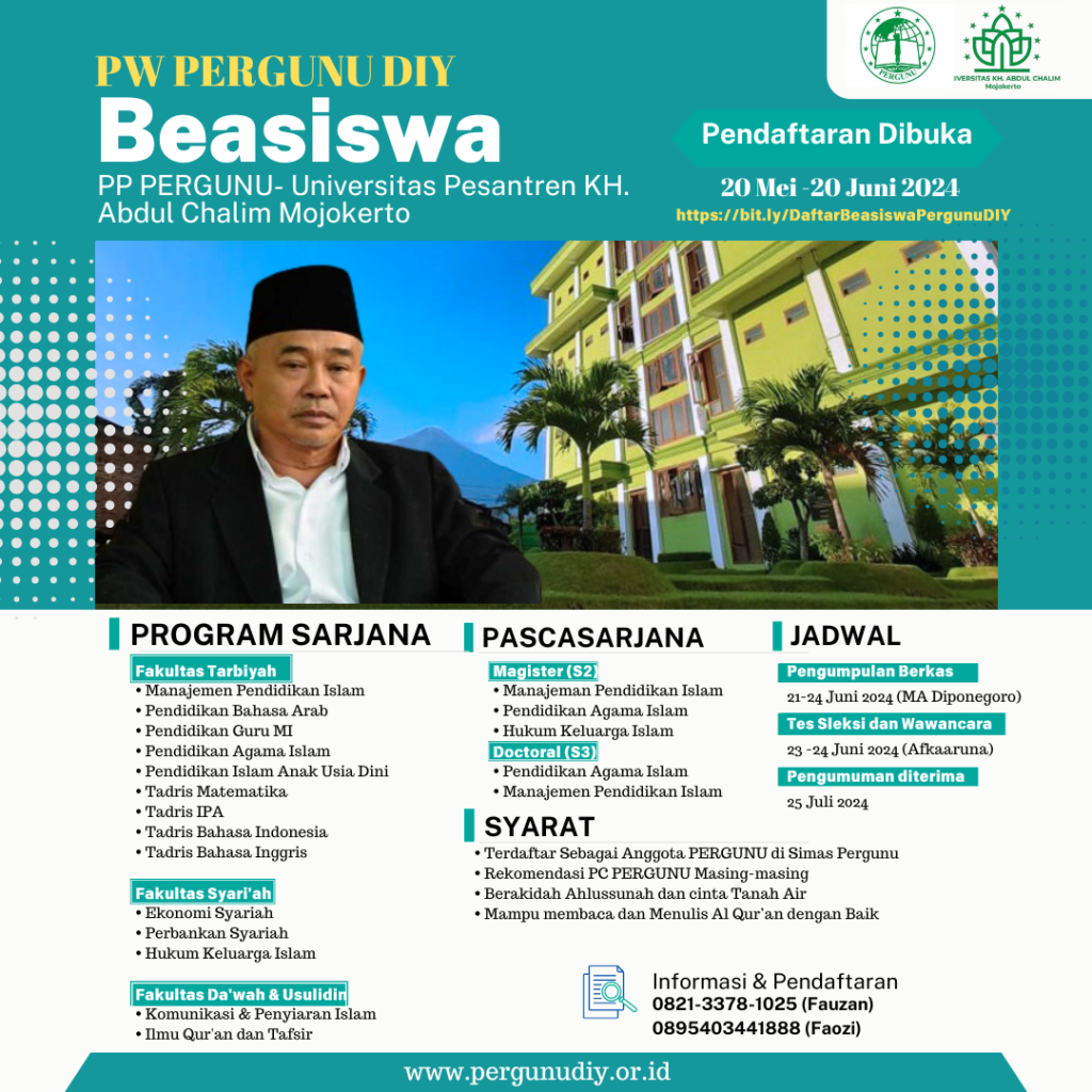 Pergunu DIY –YOGYAKARTA– PW Pergunu DIY membuka beasiswa S1, S2, dan S3 kuliah di UAC (Universitas Pesantren KH. Abdul Chalim Mojokerto). Beasiswa meliputi biaya uang gedung, sumbangan pembinaan pendidikan, asrama pesantren, dan pengajian pesantren. Demikian Samsul Ma’arif Mujiharto menyampaikan di kediamanya (05/06/24).